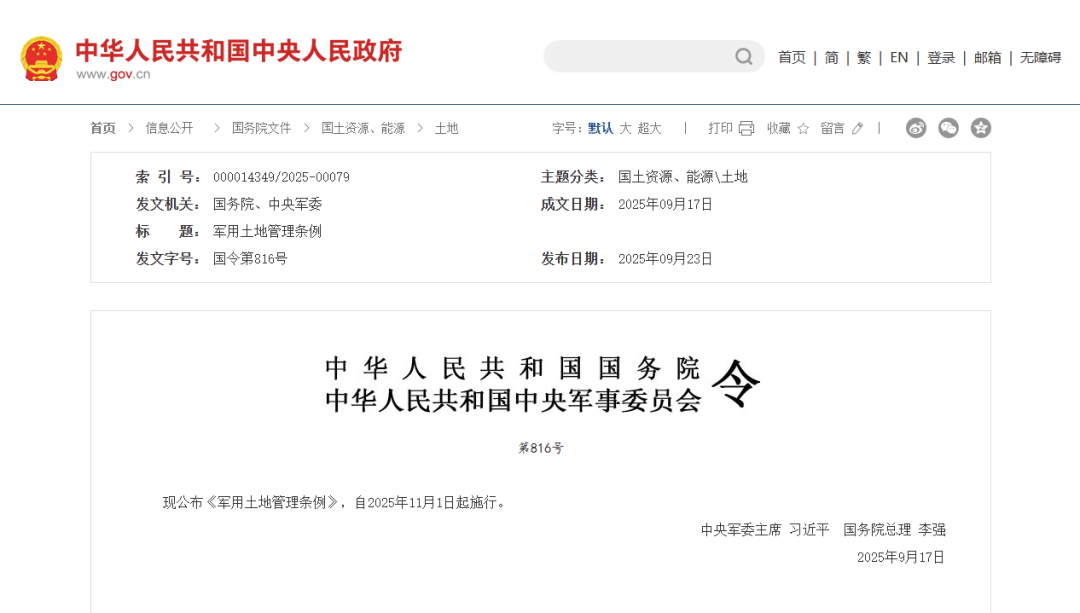 《军用土地管理条例》,11月1日起施行넶5 2025-09-28
